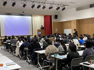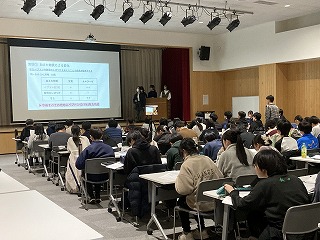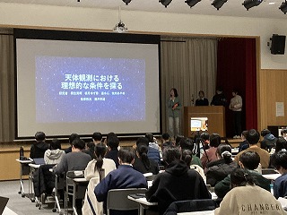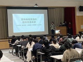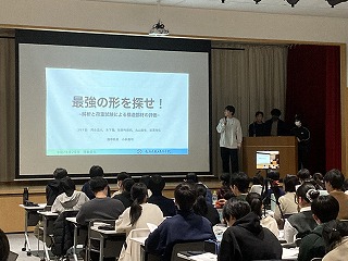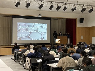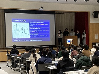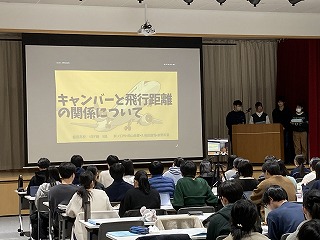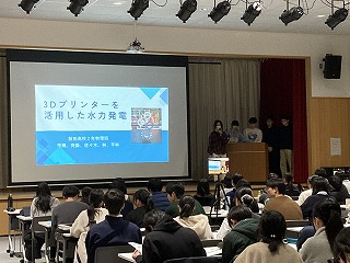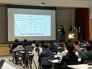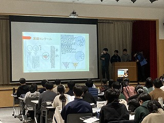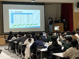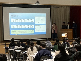 本日の発表会は、県教育委員会より中谷指導主事を講師にお迎えし、保護者や理数科1年生、教職員および一般の方々に向けての報告の場となりました。1年生も代表の1グループが理数探究基礎での取り組みについて冒頭に発表しました。